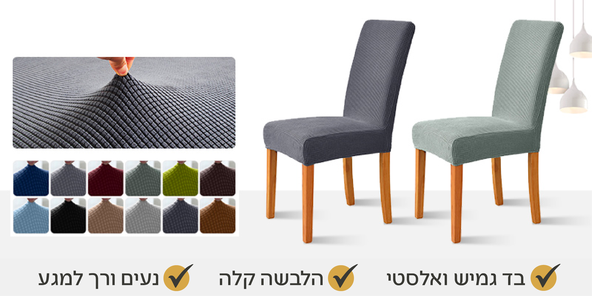 הגנו עליהם מפני לכלוך, נוזלים מכתימים, אבק ונזקי הזמן עם כיסוי כסא מבד ג'קארד איכותי, אלסטי, חסין לנוזלים, נושם ונעים למגע שיעניק מראה חדש, מרענן ויוקרתי עם מבחר צבעים רחב. בניגוד לרוב הכיסויים שמאופיינים בכפלים ומראה מרושל, אצלנו תקבלו כיסוי מבד נמתח שמתמזג עם צורת הכסא ונראה כמו חלק בלתי נפרד ממנו. הוא קל לניקוי ונעים למגע, גם בישיבה ממושכת. כל הכיסויים עברו מבדקי איכות קפדניים כדי להבטיח שימוש ארוך טווח, גם לאחר כביסות. עיצבנו מגוון רחב של כיסויים לכסאות אוכל בצבעים אחידים, החל מצבעים סולידים ושקטים ועד לצבעים נועזים ומלאי נוכחות.