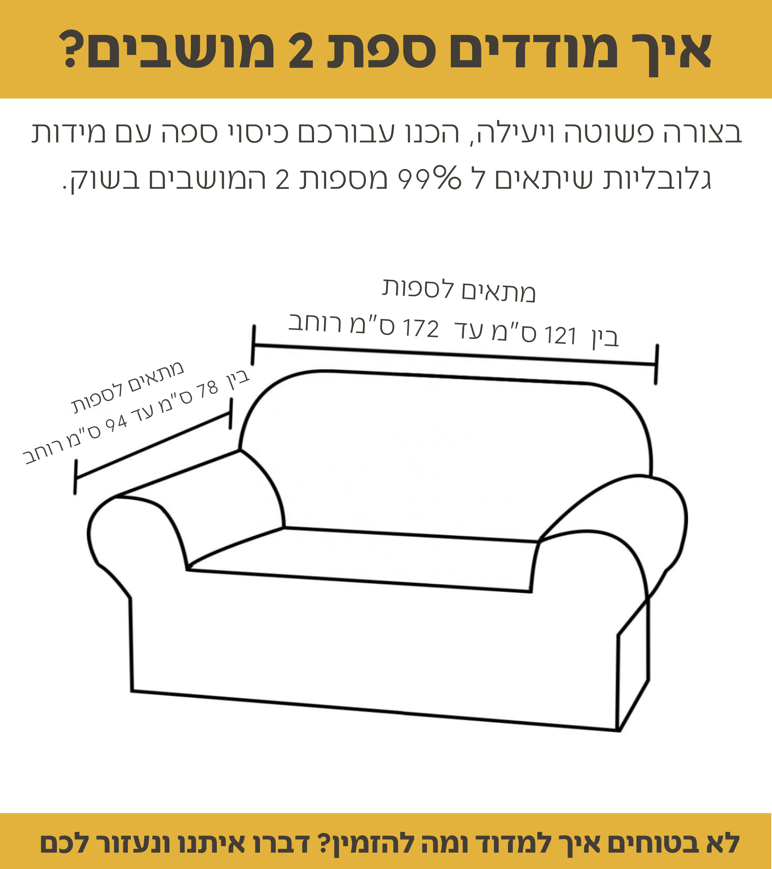 בדיוק בשביל זה דאגנו לכם לתמיכה מלאה ע"י מענה אנושי כמעט בכל שעה ביום (חוץ מימי שישי ושבת, בכל זאת אנחנו חייבים לנוח), ככה שבכל מצב שבו אתם לא בטוחים, צרו עם התמיכה שלנו קשר ואנחנו נדאג להדריך אתכם איך למדוד את המושבים שלכם בצורה הטובה ביותר כדי שהכיסוי שתזמינו יתאים ממש כמו כפפה... לספה?! כיסא?! אתם תחליטו.